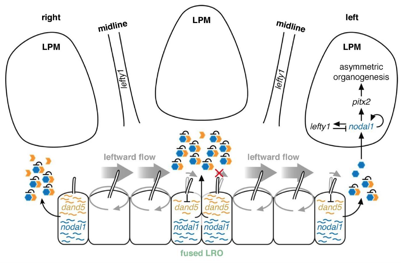 Experimentally created conjoined Xenopus embryos harbor a fused LRO in which the left margin of the right twinâs LRO is fused to the right margin of the left one. Cilia-generated flow across the fused LRO represses dand5 and induces asymmetric LRONodal signaling only in the lefttwin, while flow is insufficient to de-repress nodal1 in the fused central domain. As a result, the righttwin lacks a biased asymmetric LRO signal and organ asymmetry develops in a random fashion.
