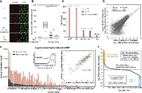 (E) Ensemble view of ZGA: total nascent EU-RNA amount with background subtraction within entire blastula embryos.