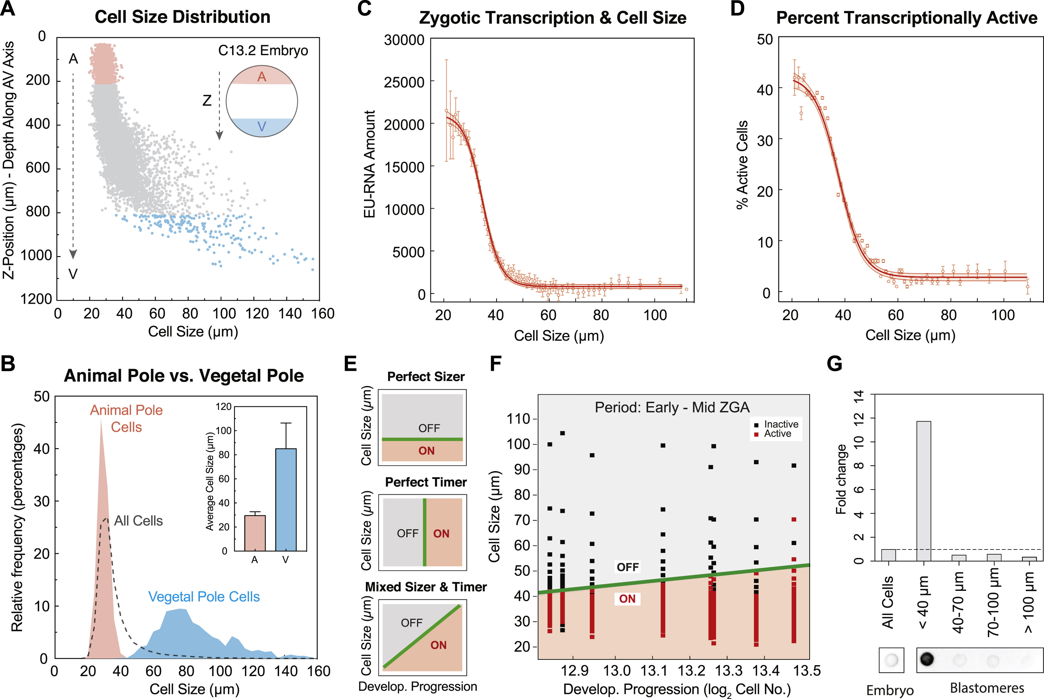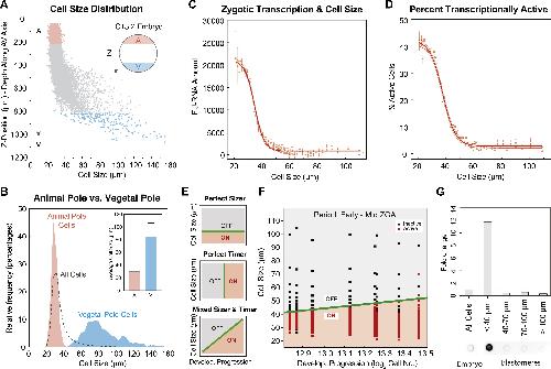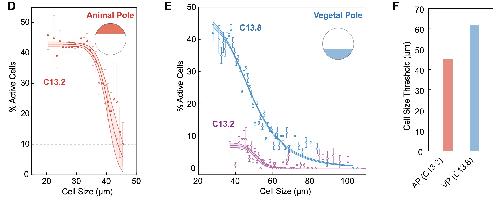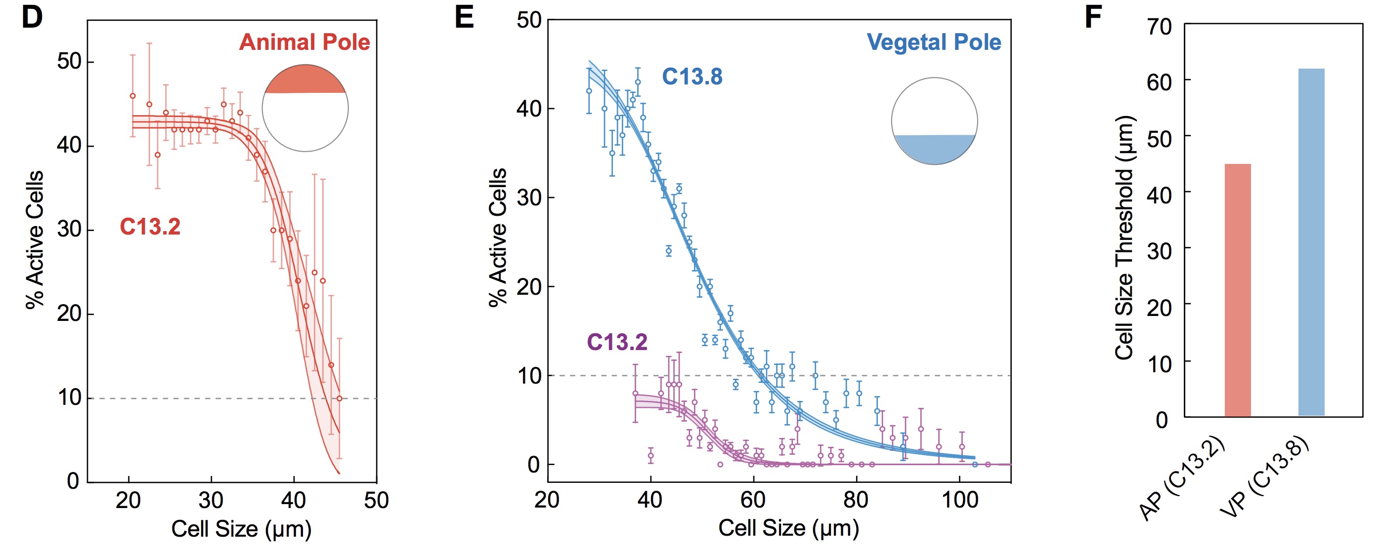 (F) Cell size threshold for transcription at the animal and vegetal pole. We define ZGA initiation for a bin of cells as 10% of cells being activated. Here this occurs at a size threshold of ~ 45 µm at the animal pole and ~ 62 µm at the vegetal pole. Data fit using Hill function, with 95% CI band. |