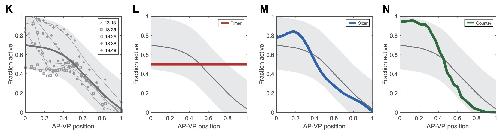 (M) Cell sizer model prediction of fraction activated cells as a function of position along AV axis by timer (blue line), com- pared to experimental data (gray line and confidence interval).