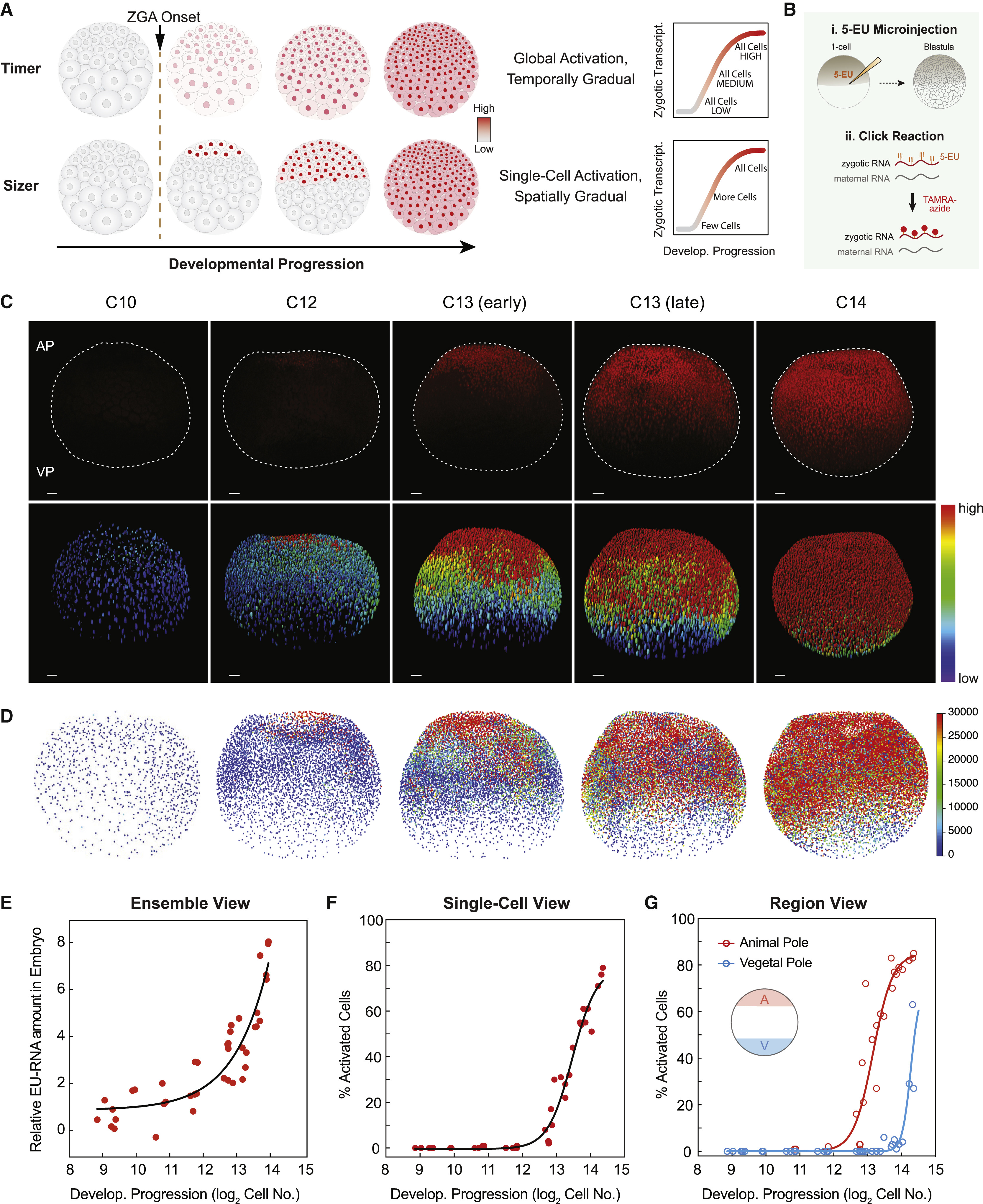 (G) Regional view of ZGA: percentage of cells above the threshold EU-RNA amount in nucleus of the animal (A, red) and vegetal (V, blue) pole in each blastula embryo. Animal pole and vegetal pole at 200-μm depth from the top and the bottom, respectively.