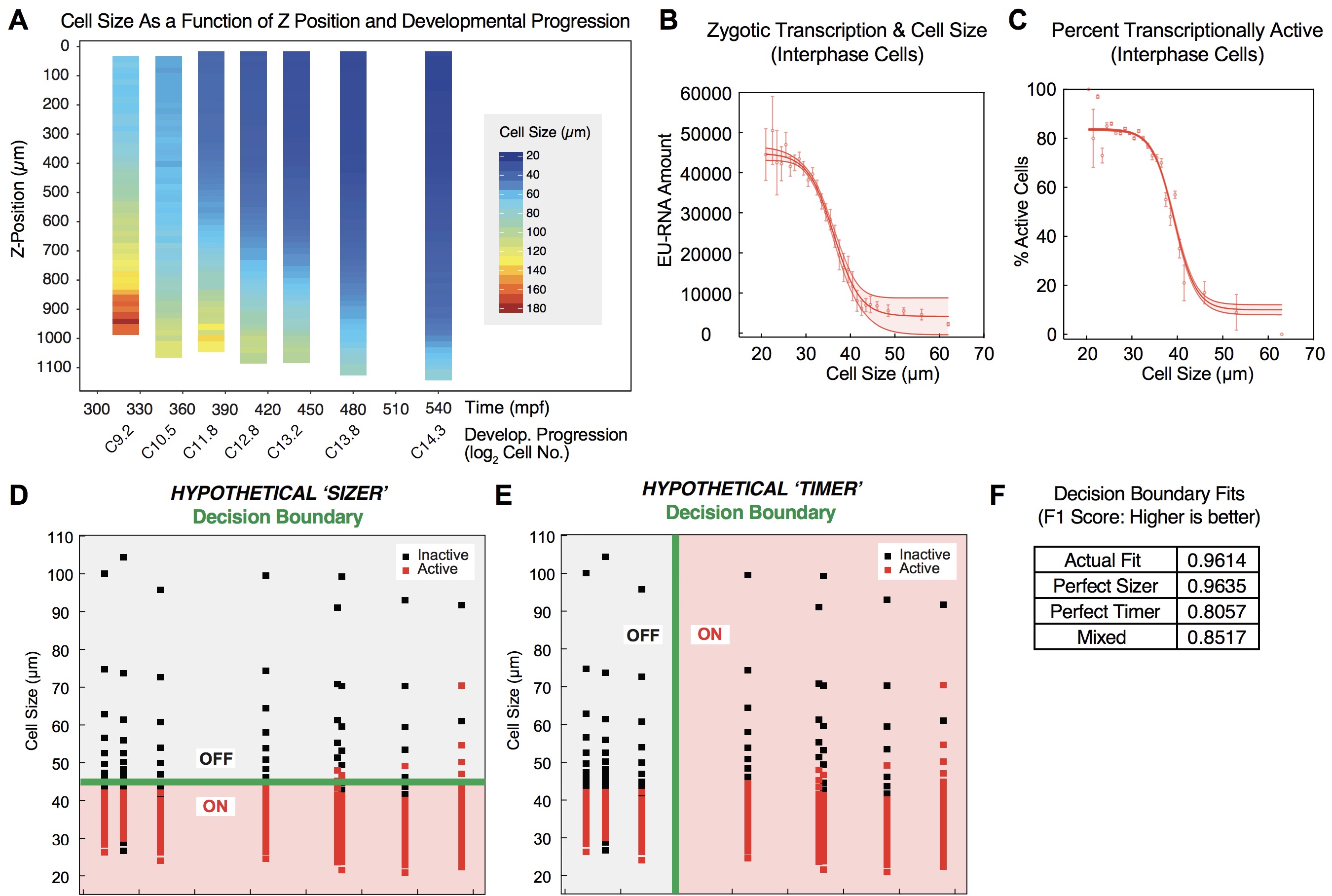 (J) Logistic regression boundary decision for ZGA as a function of cell size and Z-position along the AV axis. Each point is a bin of 25 μm by Z-position followed by a bin of 250 cells for each of 8 embryos at ∼C12.8–C13.5. Binary activation based on threshold amount EU-RNA. Black square, inactive cells; red square, active cells; green line, decision boundary of ZGA.
