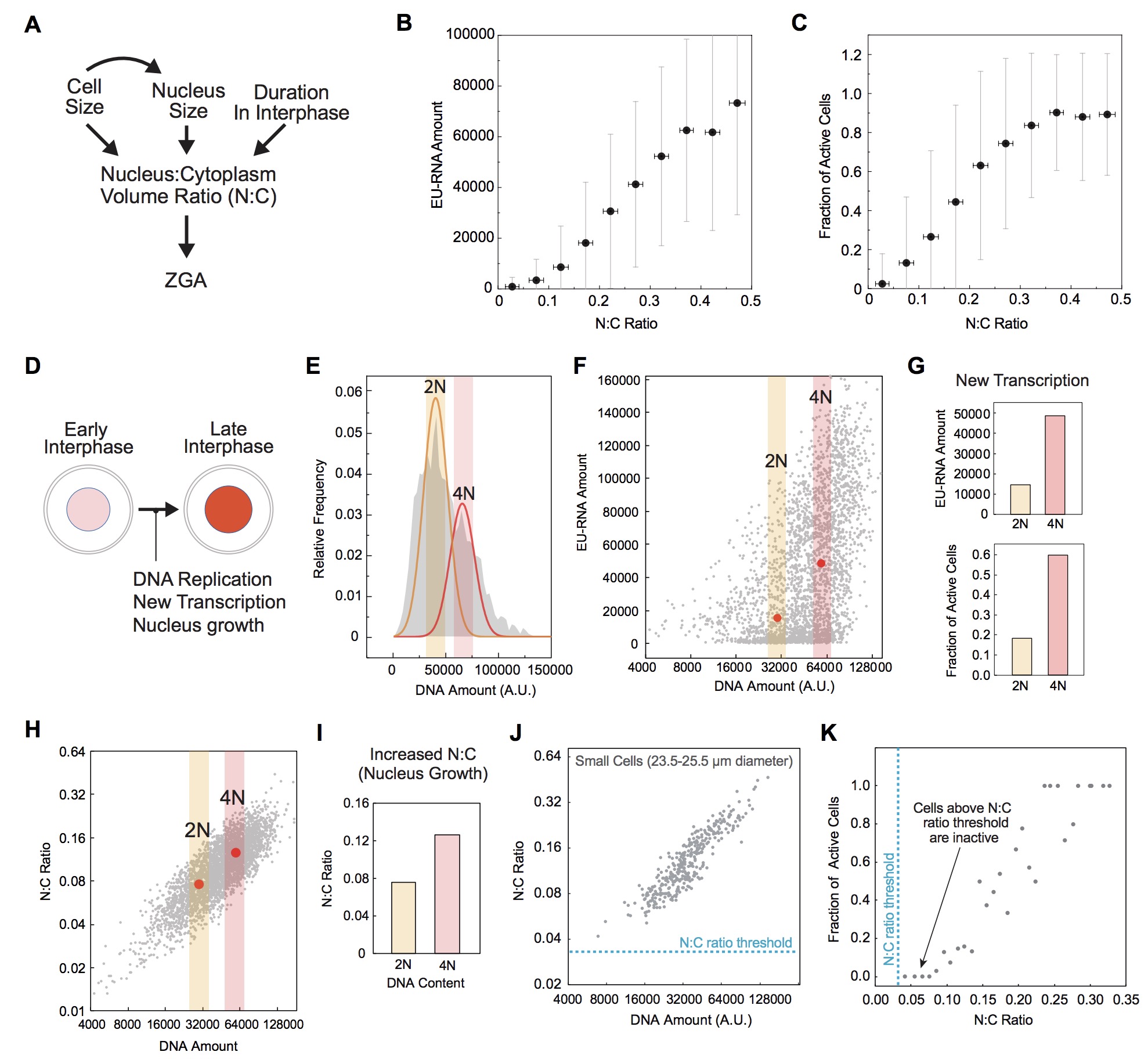 (K) Fraction of transcriptionally active cells as a function of N:C ratio for small cells (23.5-25.5 µm cell diameter). Data were binned in 0.01 increments of N:C ratio. Many cells whose N:C ratio has surpassed the threshold remain inactive. |