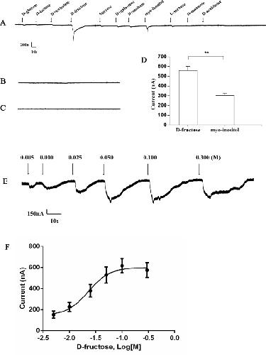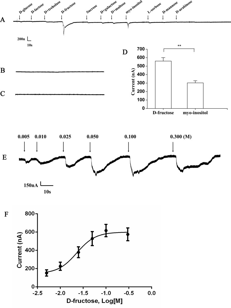 Fig 5. Two-electrode voltage-clamp recordings of Xenopus oocytes expressing TchiGR43a isolated in the present study.(A) Inward current responses of the oocytes expressing TchiGR43a in response to 0.100 M solution of the 11 sugars. (B) Xenopus oocytes with no injection. (C) Xenopus oocytes injected with ddH2O. (D) Inward current responses of the oocytes expressing TchiGR43a in response to 0.100 M solution of D-fructose and myo-inositol (mean ± SEM (n = 5)). (E) The oocytes expressing TchiGR43a stimulated with a range of D-fructose concentrations. (F) Dose-response curve of the oocytes expressing TchiGR43a to D-fructose. EC50 = 0.023 M. Bars indicate SEM (n = 6).