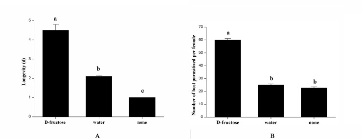 Fig 2. Longevity and fecundity of female T. chilonis when supplied with D-fructose, water and nothing.(A) Longevity, error bars indicate SEMs from the analysis of 30 replications (P < 0.05).; (B) Fecundity, error bars indicate SEMs from the analysis of 60 replications (P < 0.05).