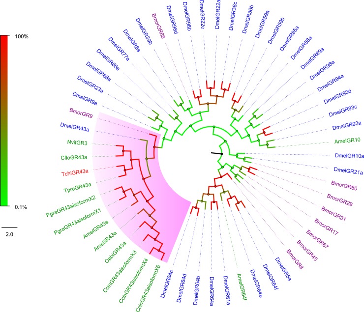 Fig 3. Phylogenetic analysis of putative gustatory receptors of T. chilonis.The tree was constructed in MEGA6.0 using the neighbor-joining method. TchiGR43a from T. chilonis are labelled with red, GRs from D. melanogaster (Diptera) are labelled with blue, GRs from B. mori (Lepidoptera) are labelled with purple, and GRs from other Hymenoptera insects (T. pretiosum, N. vitripennis, Apis mellifera, C. floridanum, Cephus cinctus, Orussus abietinus, Pseudomyrmex gracilis and Athalia rosae) are labelled with green.