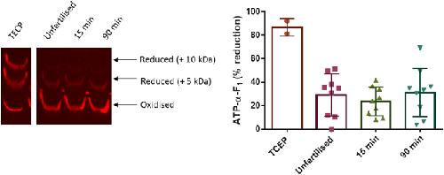 Fig. 4. Trans-cyclooctene-methyltetrazine (TCO-Tz) Click PEGylation reduction (Click-PEGRED) confirms substantial reversible ATP-α-F1before and after fertilisation in X. laevis. Left. Western blot image showing reduced (i.e., mass shifted 5 and 10 kDa bands) relative to reversibly oxidised ATP-α-F1 (bottom band) before and after (15 and 90 min) fertilisation in X. laevis. Right. Percent ATP-α-F1 reduction before (n = 9) and after fertilisation (n = 9) in X. laevis quantified. Each n = a pool of 5 eggs/embryos. The positive control refers to a TCEP (50 mM for 30 min) treated sample. A one way ANOVA revealed no significant differences between time-points (P = 0.6366).