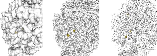 Fig. 6. Three dimensional molecular model of mitochondrial F1-FoATP synthase in state 3a derived fromRef. [65]in Bos taurus. State 3a corresponds to a catalytic rotary state of the F1 domain. Cysteine residues are highlighted in yellow, with C244 on the left and C294 on the right in each model display (left: surface; centre: space fill; right: ribbon). (For interpretation of the references to colour in this figure legend, the reader is referred to the Web version of this article.)
