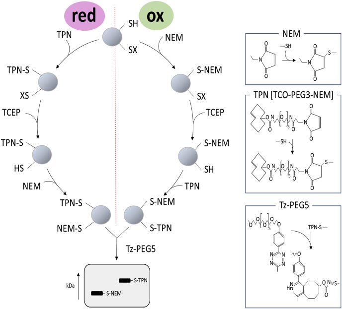 Fig. 1. Catalyst-free trans-cyclooctene-methyltetrazine (TCO-Tz) Click PEGylation schematic. The left side of the circle depicts the TCO-Tz Click PEGylation reduction (Click-PEGRED) protocol wherein reduced thiols are labelled with TCO-3 polyethylene glycol (PEG)-maleimide (TCO-PEG3-NEM, TPN); (2) before 6-methyltetrazine PEG 5 kDa (Tz-PEG5) is added to initiate the inverse electron demand Diels alder reaction and thereby mass shift reduced thiols. An optional Tris (2-carboxyethyl)phosphine hydrochloride (TCEP) reduction step to reduce reversibly oxidised thiols before labelling them with N-ethylmaleimide (NEM) is depicted. The right side of the circle depicts the TCO-Tz Click PEGylation oxidation (Click-PEGOX) protocol wherein (1) reduced thiols are labelled with NEM; (2) reversibly oxidised thiols are reduced with TCEP; (3) before being labelled with TCO-PEG3-NEM (TPN); and (4) 6 Tz-PEG5 is added to initiate the inverse electron demand Diels Alder reaction and thereby mass shift reversibly oxidised thiols. The insets on the far right depicts NEM mediated Michael addition (top), TPN mediated Michael addition to a reduced thiol (middle) and the inverse electron demand TCO-Tz Diels Alder reaction (bottom).