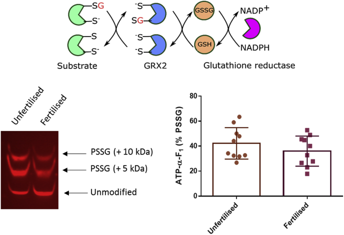 Fig. 5. ATP-α-F1is reversibly S-glutathionylated before and after fertilisation in X. laevis. Top. A reaction scheme depicting the selected chemical reduction strategy for S-glutathionylated proteins. In this scheme, GRX2 reduces S-glutathionylated proteins using glutathione (GSH) derived electrons. Glutathione reductase (GR) is used to reduce oxidised glutathione (GSSG) using NADPH. Left. Western blot image showing the S-glutathionylated (i.e., mass shifted 5 and 10 kDa bands) relative to total ATP-α-F1 (bottom band) before and after (90 min) fertilisation in X. laevis. Right. Percent reversible ATP-α-F1 S-glutathionylation (i.e., PSSG) before (n = 10) and after fertilisation (n = 10) in X. laevis quantified. Each n = a pool of 5 eggs/embryos. An independent unpaired Student's t-test revealed no statistically significant difference in reversible S-glutathionylation between time-points (P = 0.8901).
