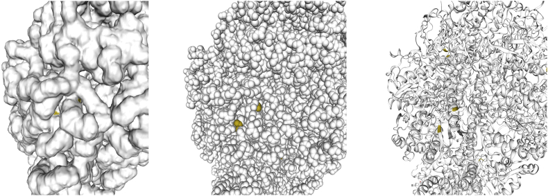 Fig. 6. Three dimensional molecular model of mitochondrial F1-FoATP synthase in state 3a derived fromRef. [65]in Bos taurus. State 3a corresponds to a catalytic rotary state of the F1 domain. Cysteine residues are highlighted in yellow, with C244 on the left and C294 on the right in each model display (left: surface; centre: space fill; right: ribbon). (For interpretation of the references to colour in this figure legend, the reader is referred to the Web version of this article.)