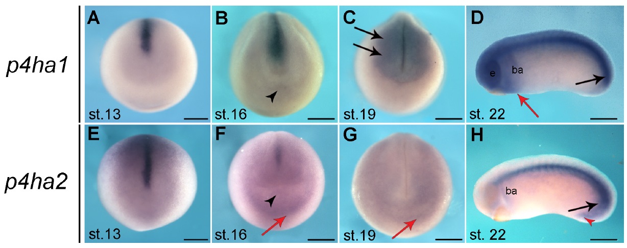 Xenopus development. (A) p4ha1 and p4ha2 expression