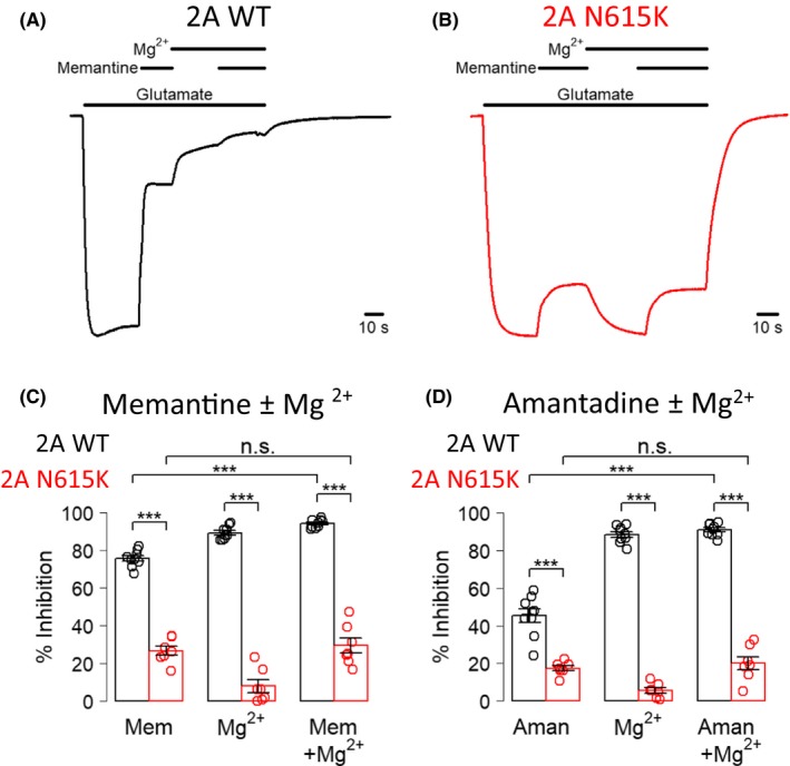 6 = 1.4, P > 0.2) (WT: n = 9 oocytes, N615K: n = 7 oocytes). D, Summary data showing percentage inhibition by amantadine (100 μmol/L), Mg2+ (1 mmol/L) and the two combined for oocytes transfected with either GluN2AWT or GluN2AN615K –containing NMDA receptors, voltage‐clamped at –60 mV. A two‐way repeated measures ANOVA (blocker as within subjects factor, subunit as between subjects factor) showed a significant main effect of channel blocker (F