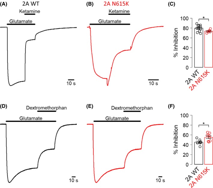 14.9 = 2.6, P = 0.019). D and E, Representative two‐electrode voltage‐clamp recordings made from oocytes transfected with GluN2AWT or GluN2AN615K–containing NMDA receptors showing response to glutamate (30 μmol/L) and inhibition by dextromethorphan (10 μmol/L) in the continuous presence of glycine (30 μmol/L). Holding potential –60 mV. F, Summary data showing percentage inhibition by dextromethorphan (10 μmol/L) for oocytes transfected with either GluN2AWT or GluN2AN615K –containing NMDA receptors, voltage‐clamped at –60 mV. An independent Welch t‐test showed that GluN2AN615K was associated with an increase in block (WT: 45 ± 2 (n = 7 oocytes), N615K: 55 ± 3 (n = 8 oocytes), t