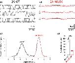 Figure 3. GluN2AN615K reduces single‐channel conductance. A and B, Representative voltage‐clamp recordings made from outside‐out patches from oocytes expressing GluN2AWT or GluN2AN615K –containing NMDA receptors in the presence of glutamate (30 μmol/L) and glycine (30 μmol/L). “C” = closed, “O” = open. Holding potential −60 mV. C, Representative amplitude histograms showing fitted normal distributions, superimposed from two different patches held at –60 mV. The means of the fitted distributions/holding potential were used to calculate conductance. D, Summary data showing conductance, calculated as current amplitude/holding potential. A t‐test showed a reduction in conductance in oocytes expressing GluN2AWT (58 ± 3 pS (n = 4), total events = 2555) and GluN2AN615K (15 ± 1 pS (n = 3), total events = 774, t
