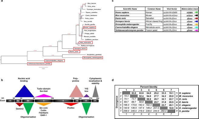 Figure 1. SMN conservation, functional domains, and homology across species. (a) The 50% majority-rule consensus tree was generated from Bayesian analysis of 21 protein sequences encoded by SMN orthologues (see Methods). The value at each branch is the Bayesian posterior probability for the split. Schizosaccharomyces pombe was assumed to be an out-group for rooting purposes. (b) The SMN protein map is divided into exon regions labeled with exon number and corresponding amino acid (AA) above. Domains of SMN that have been identified by their sequence characteristics and/or binding partners are labeled and defined by colored triangles. (c) Nomenclature of the species examined in the study. Scientific names, corresponding viral vectors and the appropriate abbreviations used. (d) Percent identity and evolutionary divergence of the species examined. Conservation relationships among tested SMN homologs. The percent identity is calculated from amino acid sequence differences. Divergence values represent information established from the phylogenetic relationship between the species. |