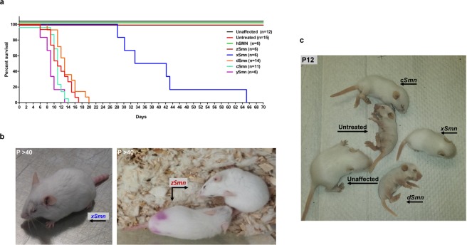 Figure 2. Delivery of SMN homologs results in variable lifespan extension in a severe mouse model of SMA. Viral vector injections for each tested SMN homolog were administered by ICV on P2 and life span was recorded. (a) Comparison of average survival time by Log-rank Mantel-Cox test. Kaplan-Meier survival curve depicts life span of healthy (unaffected), SMA (untreated) mice in comparison to SMN homologs-treated SMA mice. (b) Representative images of SMNâ7 mice (Smnâ/â;SMN2+/+;SMNâ7+/+) injected with xSmn (left panel) and zSmn (right panel) homologs, respectively, past the age of P40. The treated mice display noticeable distal necrosis, which is exaggerated on the tail, eyelids and/or ears. (c) Representative image of SMNâ7 mice injected with xSmn, cSmn, dSmn homologs compared to control littermates at P12. The xSmn injected mouse has the appearance and gait of the unaffected littermate, while the dSmn and cSmn injected animals show slower growth and development delay similar to the untreated SMA mouse. |