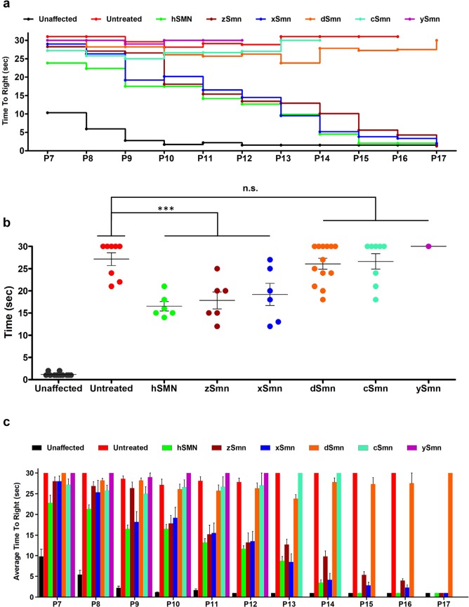 Figure 4. Assessment of motor function of treated SMNÎ7 mice after treatment with various SMN homologs. (a) Line graph representing raw data of the average time to right from P7 to P17. Animals injected with hSMN, zSmn and xSmn displayed significant improvement in motor function through their life span. (b) Scatter plot of time-to-right ability of treated cohorts highlights the difference in performance for each individual mouse (values are shown for P12). Statistical analysis was carried out by one-way ANOVA and significance is represented by â*âpââ¤â0.05; â**âpââ¤â0.01; â***âpââ¤â0.001; and ân.s.âpâ>â0.05. (c) Bar graph showing the average time-to-right in seconds of each treatment group from ages of P7 through P17, where error bars represent significance compared to the control groups. Data expressed as S.E.M. |