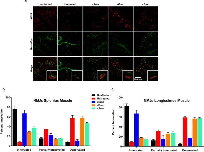 Figure 5. Neuromuscular junction pathology in SMNâ7 mice after delivery of SMN homologs. (a) Representative immunohistochemistry of NMJs of individual cohorts injected with xSmn, dSmn, cSmn and compared to the age-matched controls. Neurofilament and synaptic vesicle are shown in green. Acetylcholine receptors are stained with α-Bungarotoxin (red). NMJs were analyzed from the longissimus capitis (shown) and the splenius muscles, harvested from cohorts at P12. (b) Quantification of percent NMJ innervation in the splenius muscle. (c) Quantification of percent NMJ innervation in the longissimus muscle. Data was analyzed using by one-way ANOVA and statistical significance is represented by â*âpââ¤â0.05; â**âpââ¤â0.01; â***âpââ¤â0.001; â****âpââ¤â0.001; ân.s.âpâ>â0.05 and expressed as S.E.M. |
