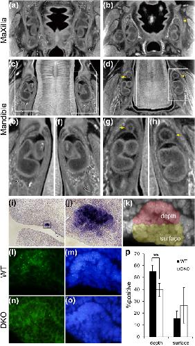 Figure 2. Formation of the supernumerary tooth in the double KO homozygote of MRCS1 and MFCS4. Transverse sectional micro-CT images of the maxilla (a,b) and mandible (câh) in the wild type (WT) (a,c,e,f) and the DKO mouse (b,d,g,h). Maxillary tooth in the WT (a) and the DKO mouse (b). Mandibular tooth in the WT (c,e,f) and the DKO mouse (d,g,h). Magnified pictures of the insets of c (e,f) and of d (g,h). Yellow arrows indicate supernumerary teeth. The double KO homozygote of MRCS1 and MFCS4 is schematically illustrated in Supplementary Fig. 1e. Expression of Shh mRNA in the dental placode of the WT at E12.5 (i) and high magnification of the dental placode (j, an open box in i). Nuclei of the dental placode were stained with DAPI. The depth half and the superficial half are shown in red and yellow, respectively (k). Signals for Shh nascent RNA in the dental placode of the WT and DKO (l,n), and cells were stained with DAPI (m,o). The %positive cells transcribing Shh in the depth and the surface of the dental placode (p). The black and open bars depict the wild type and the DKO, respectively. Error bars represent the standard deviations obtained from three independent samples. Two-tailed Studentâs t-test was used to test significance of differences in number of signal-positive cells (**Pâ<â0.001).