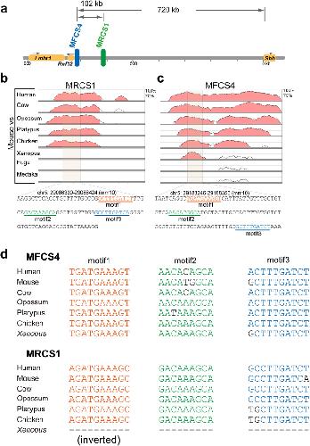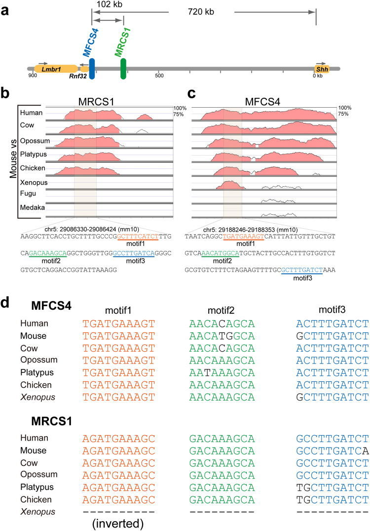 Figure 3. Motifs shared between MRCS1 and MFCS4. (a) Diagram of the upstream region of the mouse Shh locus. The two epithelial enhancers MFCS4 (blue) and MRCS1 (green) are located at 620â720âkb upstream of the Shh TSS. Comparison of mouse MRCS1 (b) and MFCS4 (c) in vertebrate taxa by Vista plots. A shaded region represents the core unit of the enhancer, which contains three shared motifs. The core sequences are shown at the bottom of (b). (d) Alignments of the three motifs in the MFCS4 and MRCS1 sequences, which were obtained from seven vertebrate species.