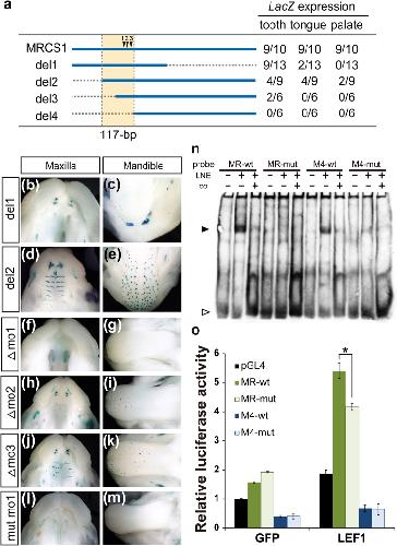 LacZ expression patterns in transgenic mice with MRCS1 deletion constructs. Diagram of deletion constructs of MRCS1 (a). Dotted lines show the region deleted in each construct. Arrowheads indicate the three motifs shown in Fig. 3. Numbers of LacZ-positive embryos among transgene-positive embryos in each organ are shown in the right column. LacZ expression patterns in the maxilla (b,d) and mandible (c,e) with deletion construct 1 (del1; b,c) and deletion construct 2 (del2; d,e). LacZ expression patterns in transgenic mice with deletions of motif1 (Îmo1: f,g; nâ=â6), motif2 (Îmo2: h,I; nâ=â8) and motif3 (Îmo3: j,k; nâ=â7) and a silent mutation of motif1 (mut mo1: l,m; nâ=â10). (n) EMSA with sequences at motif1 of MRCS1 and MFCS4 (MR-wt and M4-wt), and sequences with a silent mutation of motif1 (MR-mut and M4-mut, respectively). An arrowhead indicates a specific band shift. An open arrowhead indicates free probes. LNE is an abbreviation of nuclear extracts derived from Lef1-overexpressing cells. Cold oligos as a competitor, co. (o) Relative luciferase activity of the core MRCS1 (MR-wt), the core MRCS1 with a silent mutation of motif1 (MR-mut), the core MFCS4 (M4-wt) and the core MFCS4 with a silent mutation of motif1 (M4-mut) in HEK293T cells. The luciferase reporter constructs containing the core enhancer sequences were cotransfected with plasmid vectors expressing Gfp and Lef1. The reference value for cotransfection with Gfp-expressing and pGL4 empty plasmids was set as 1. Error bars represent the standard deviations obtained from three independent experiments. An asterisk shows a significant difference, as evaluated by Studentâs t test (o, pâ<â0.05).