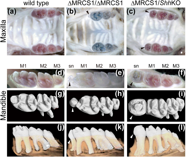 Figure 1. Molar pattern in the MRCS1 KO homozygote and the compound heterozygote of MRCS1 and Shh KO alleles. Occlusal views of maxilla in the wild type mouse (a), the MRCS1 KO homozygote (b, ÎMRCS1/ÎMRCS1) and the compound heterozygote (c, ÎMRCS1/ShhKO) at one month old. Molar pattern in the mandible of the wild type (d,g,j), the MRCS1 KO homozygote (e,h,k) and the compound heterozygote (f,i,l). Three-dimensional reconstructions of X-ray micro CT images of molars are shown in gâl. Arrowheads mark supernumerary teeth. The alleles of the compound heterozygote of the ÎMRCS1 and the Shh coding sequence KO alleles are schematically illustrated in Supplementary Fig. 1d. M1, first molar; M2, second molar; M3, third molar.