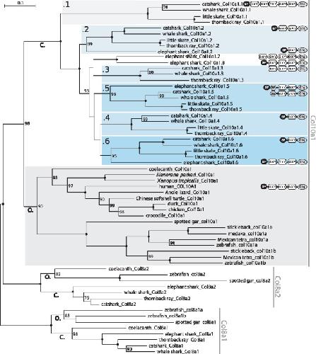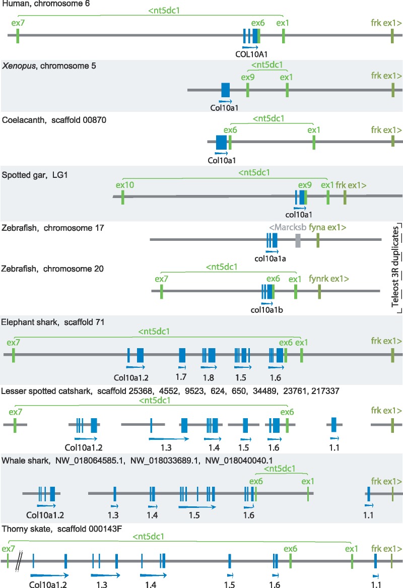 Fig. 1. Conserved synteny between Col10a1 genomic region in osteichthyan species: human, Xenopus, coelacanth, spotted gar, zebrafish; and region containing Col10a1 gene duplicates (numbered .1â.8) in chondrichthyan species: elephant shark, catshark, whale shark, and thorny skate. Genomic data for osteichthyan species were extracted from public databases (Ensembl, NCBI, XenBase) and analyzed to reconstruct the synteny blocks of duplicated Col10a1 genes in chondrichthyans. Distances are to scale within each species but may differ between species. Abbreviation: ex, exon.