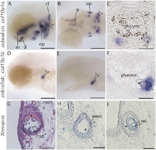 Fig. 4. Expression of zebrafish col10a1a and col10a1b and Xenopus Col10a1 during tooth development detected with in situ hybridization. (A, B) col10a1a expression in whole-mount zebrafish larvae at 4 and 6âdays post fertilization (dpf). (C) col10a1a expression in post in situ paraffin sections of zebrafish larvae at 5âdpf. (D, E) col10a1b expression in whole-mount zebrafish larvae at 4 and 6âdpf. (F) col10a1b expression in post in situ paraffin sections of zebrafish larvae at 4âdpf. (G) HE staining of a longitudinal section through a developing tooth bud of a Xenopus larva at stage NF57. (H, I) Col10a1 expression in Xenopus tooth bud on successive transversal sections. Open arrowheads point at developing pharyngeal teeth and asterisk marks the mineralizing matrix. Scale bars: 100âµm (A, B, D, E), 50âµm (C, F), 20âµm (G, H, I). Abbreviations: amel., ameloblasts; cl, cleithrum; d, dentary; m, maxilla; od., odontoblasts; op, opercle; p, parasphenoid; sec. amel., secretory ameloblasts.