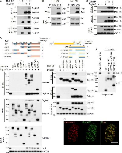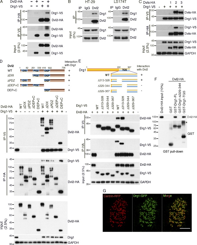 Figure 1. Drg1 associates with Dvl. (A) Exogenous Drg1 interacts with Dvl2. Dvl2-HA and Drg1-V5 mRNAs were injected in Xenopus embryos, and reciprocal co-IPs were performed. 2.5% of input was loaded. (B) Endogenous Drg1 associates with Dvl2. Using lysates from HT-29 and LS174T colon cancer cells, endogenous co-IPs were performed by precipitating endogenous Dvl2. 2.5% of input was loaded. IgG pull-down is a negative control. (C) Drg1 interacts with Dvl2 and Dvl3, but not Dvl1. The indicated Dvl-HA and Drg1-V5 mRNA were coinjected, and co-IPs were conducted by pull-down in both directions. 2.5% of input was loaded. (D) Drg1 interaction domain mapping of Dvl2. The DEP+C region of Dvl2 is necessary and sufficient to interact with Drg1. The indicated WT and deletion mutants of Dvl2-HA and Drg1-V5 mRNAs were expressed in Xenopus embryos, and co-IPs were performed in both directions. 2.5% of input was loaded. (E) Dvl2 interaction domain mapping of Drg1. WT and the indicated deletion mutants of Drg1-V5 and Dvl2-HA were expressed in Xenopus embryos, and co-IPs were conducted in both directions. Amino acids between 329 and 344 of Drg1 are required for the association with Dvl2. 2.5% of input was loaded. (F) Dvl2-HA associates with Drg1-GST in vitro. 1 µg of the purified recombinant proteins was used for the in vitro binding assay. The asterisk marks a dimerized form of isolated TGS domain. 10% of input was loaded. (G) The subcellular localization of Drg1 in an MCC. Drg1-GFP (green) and centrin-RFP (red, basal body marker) mRNAs were coinjected into the marginal region of both ventral blastomeres at the four-cell stage. The embryos were observed at stage 25. Images were generated by maximum intensity projection from serial z-stack images. Scale bar, 5 µm. |