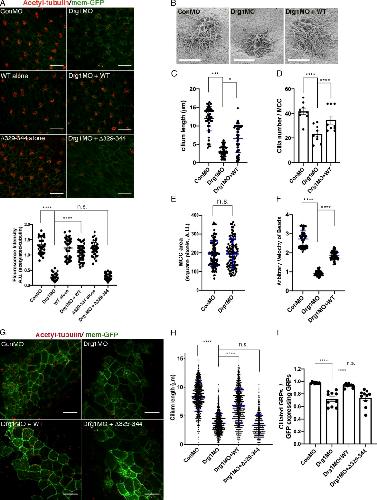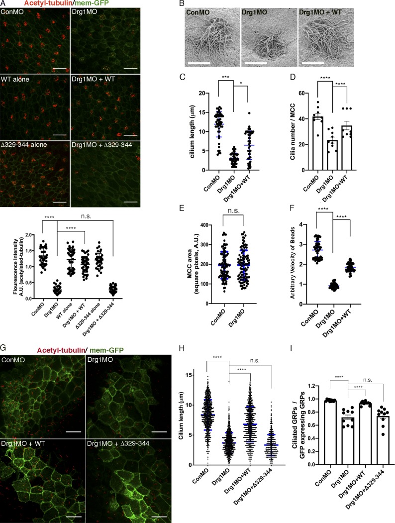 Figure 2. The Drg1âDvl interaction is important for ciliogenesis in MCCs and the GRP. (A) Drg1 knockdown causes a significant reduction of acetylated tubulin on the epidermis of tadpoles, and the expression of WT Drg1, but not the Î329â344 mutant, rescues the knockdown phenotype. A cocktail of synthetic mRNAs and morpholinos (7.5 ng each) was injected into both ventral blastomeres at the four-cell stage of embryos. The injected embryos were fixed at stage 27. For immunostaining, anti-acetylated tubulin antibody was used to visualize multicilia (red), and membrane-GFP (green) was used as a tracer. Relative acetylated tubulin intensity is quantified (image n = 45 from 15 embryos for each condition). ****, P < 0.0001, one-way ANOVA; scale bars, 100 µm. Error bars indicate ± SD. (B) Scanning EM of embryonic epidermis confirms Drg1 knockdown causes ciliogenesis defects. 7.5 ng of control and Drg1 morpholinos was injected into both marginal ventral blastomeres at the four-cell stage, and embryos were fixed at stage 31. Scale bars, 12 µm. (C) Quantification of cilia length in MCCs. Data are plotted as the mean, with error bars representing SD. Measured cilia, n > 100; embryos per group, n = 3; ***, P < 0.001; *, P = 0.012, one-way ANOVA. (D) Quantification of cilia number per MCC, n = 10; embryos per group, n = 3; ****, P < 0.0001, one-way ANOVA. Error bars indicate ± SD. (E) The area of epidermal MCCs of stage 27 embryos; MCCs, n = 100; embryos per group, n = 10; two-tailed unpaired t test. Error bars indicate ± SD. (F) Quantification of the fluid flow with green fluorescent beads (Videos 1, 2, and 3). Velocity of five beads along the body axis was manually measured. Measured bead velocity per embryo, n = 5; embryos (stage 27â28) per group, n = 10; stage 27 embryos; ****, P < 0.0001, one-way ANOVA. Error bars indicate ± SD. (G) Drg1 knockdown decreases the length of cilia in the GRP. The indicated mRNAs and MOs were injected to both marginal dorsal blastomeres at the four-cell stage, and embryos were harvested at stage 18. Dissected GRPs were fixed, followed by immunostaining using acetylated tubulin antibody (red) and anti-GFP antibody (green). Mem-GFP is used as a tracer. Scale bars, 30 µm. (H) Quantification of cilia length in the GRP, measured cilia per group; n > 900, dissected GRPs per group; n = 10, ****, P < 0.0001, one-way ANOVA. Error bars indicate ± SD. (I) Quantification of cilia number on GRP; the ratio of the number of ciliated cells expressing GFP to total GRP cells expressing GFP in experimental groups is normalized to the control and expressed as a relative value to the control (set as 1). GRPs per group; n = 10, ****, P < 0.0001, one-way ANOVA. Error bars indicate ± SD. a.u., arbitrary units; n.s., not significant. |