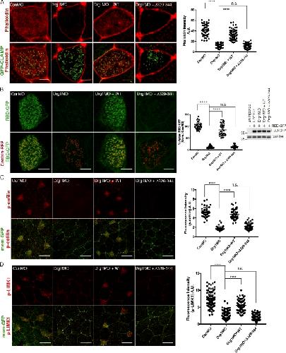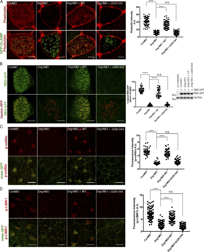 Figure 4. Drg1âDvl interaction modulates apical actin enrichment in MCCs through Rho activation. (A) Apical actin meshwork decreases upon Drg1 knockdown. The loss of apical actin signal is rescued by expression of Drg1 WT, but not by the Drg1 Î329â344 mutant. The embryos were injected with the indicated MOs and mRNAs, fixed at stage 25, and stained with phalloidin (red) to visualize cortical F-actin in apical region of MCCs. GFP-CLAMP (green) marks rootlets. ****, P < 0.0001, one-way ANOVA; n = 65. Scale bars, 5 µm. Error bars indicate ± SD. (B) Drg1 knockdown decreases Rho activity. Synthetic mRNAs of RBD-GFP (green) and centrin-RFP (red) were coinjected with the indicated MOs and mRNAs, and embryos were fixed at stage 25. Fluorescence intensity of experimental groups is normalized to the control MCCs and expressed as a percentage relative to control. Expression level of RBD-GFP was tested by Western blot. Images are generated by maximum intensity projection of serial z-stack confocal images from apical (0 µm) to subapical region (â2.5 µm). ****, P < 0.0001, one-way ANOVA; n = 49. Scale bars, 5 µm. Error bars indicate ± SD. (C and D) Phosphorylation of Rho downstream targets is decreased by Drg1 knockdown. The embryos injected with the indicated MOs and mRNAs were stained for phospho-cofilin (C) and phospho-LIMK1 (D). Statistical analysis by one-way ANOVA with post hoc Turkeyâs multiple range tests. All results are derived from three independent experiments. ****, P < 0.0001, one-way ANOVA; n = 42 (C), 40 (D). Error bars represent mean ± SD. Scale bars, 30 µm. a.u., arbitrary units; n.s., not significant. |