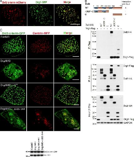 Figure 5. Drg1 knockdown has a mild effect on Dvl localization to the basal body region in MCCs. (A) Drg1 colocalizes with the Dvl2 C terminus in MCCs. The mRNAs of the Dvl2 C-terminal fragment tagged with mCherry and Drg1-GFP were coinjected into both marginal ventral blastomeres of four-cell-stage embryos and fixed at stage 25. Images are generated by maximum intensity projection of serial z-stack confocal images. Scale bar, 10 µm. (B) The C-terminus of Dvl2 associates with Drg1. The indicated HA-tagged Dvl2 mutants were coexpressed with Drg1-Flag, and co-IP was performed. (C) Drg1 knockdown diminishes Dvl2 C-terminal localization to the basal body area. mRNAs of Dvl2-c-term-GFP and centrin-RFP (basal body marker) were coinjected with the indicated MOs and mRNAs. The expression level of Dvl2-c-term-GFP was tested by Western blot. Embryos were fixed at stage 25â27. Serial z-stack images were generated. A maximum intensity projection image is shown. Scale bars, 5 µm. |