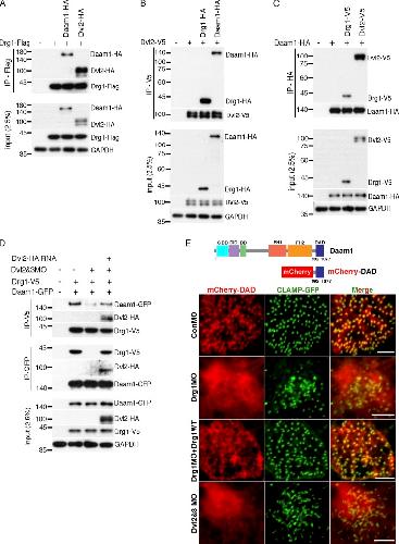 Figure 6. Drg1 is required for DvlâDaam1 signaling in MCCs. (AâC) The affinity of protein interactions among Drg1, Dvl2, and Daam1 were tested by IP with the adjusted expression levels of two proteins tagged with the same epitope while expressing the other binding partner tagged with a different epitope. The indicated mRNAs were injected at the one-cell stage, and co-IPs were performed using embryos at stage 12. (D) The Drg1âDaam1 interaction is disrupted by Dvl knockdown. Drg1-V5 and Daam1-GFP mRNAs were coinjected with Dvl2 and Dvl3 MOs and/or Dvl2-Flag (MO resistant) mRNA, and co-IPs were performed with embryos harvested at stage 20. The reduced interaction between Drg1 and Daam1 is restored by Dvl2-Flag expression. (E) mCherry-DAD and GFP-CLAMP mRNAs were coinjected with the indicated mRNAs and MOs, and MCCs of embryos at stage 25 were observed. The close location of mCherry-DAD to CLAMP-GFP was disrupted by Drg1 or Dvl knockdown in MCCs. Images were generated by maximum intensity projection of serial z-stack confocal images from surface to subapical regions (up to â2 µm). Scale bars, 5 µm. DD, dimerization domain; DID, diaphanous inhibitory domain; FH1, formin homology 1; FH2, formin homology 2; GBD, GTPase-binding domain. |