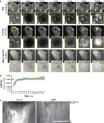Fig. 3. RhoA activity is increased the over entire area of the wound-site. a Maximum intensity projections of selected micrographs of the CellMask, UtrCH, and γGBD signals following laser-mediated ablation of the PM of HeLa cells. b Normalized γGBD fluorescent signal intensity (γGBD FIR) at the wound site relative to control regions. Mean and SEM shown of n = 12 cells. c Kymographs of the UtrCH and γGBD signals before and after laser-mediated ablation of the PM. Cell and targeted area is the same as in the one shown in a. Targeted area (95 μm2) is represented by the red circle found on the pre-wounded, PM micrograph. The line scan region used for the creation of the kymograph correspond to the cyan line (22 μm) displayed on the 0 s, γGBD micrograph. The cell shown in a, c is representative of n = 12 wounding assays, all of which were used to prepare b. Scale bars = 10 μm