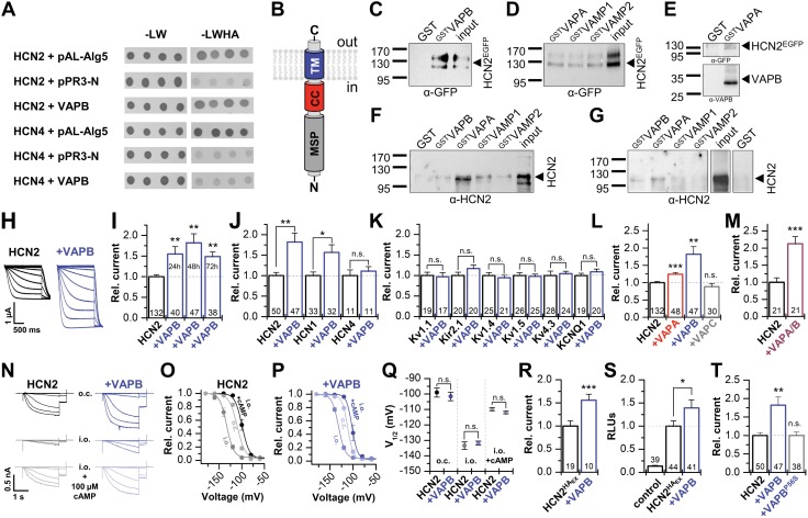 Figure 1. VAPB selectively increases HCN1 and HCN2 currents. A) Y2H direct interaction assay. Transformation control (-LW), leucine, and tryptophan dropout. Interaction read-out (-LWHA), additional dropout of histidine and adenine. pAL-Alg5, positive control. pPR3-N, negative control. B) Topology of VAPB. C) GSTVAPB pull-down of HCN2EGFP using transfected HeLa cells. D) GSTVAPA, GSTVAMP1, or GSTVAMP2 pull-down of HCN2EGFP using transfected HeLa cells. E) GSTVAPA pull-down of HCN2 and endogenous VAPB, using HCN2EGFP transfected HeLa cells. F) Pull-down of in vitro translated HCN2 (untagged). G) Pull-down of HCN2 from rat brain lysates. H, I) Representative currents (H) of HCN2 expressed in oocytes alone or with VAPB and the relative current amplitudes (I) analyzed over 3 d. J) Relative currents of HCN1, HCN2, and HCN4 alone or coexpressed with VAPB. K, L) Relative currents of different potassium channels (K) coexpressed with VAPB and of HCN2 (L) coexpressed with VAPA, VAPB, or VAPC. M) Relative currents of HCN2 coexpressed with a mixture of VAPA/B (1:1). N) Representative macropatch recordings in different configurations: on cell (o.c.), inside-out after patch excision (i.o.), and after application of 100 µM cAMP (i.o.+100 µM cAMP). O, P) Activation curves for HCN2 alone (n = 6) (O), recorded as in N, or after coexpression with VAPB (n = 8) (P). Q) V1/2 values for HCN2 expressed alone or with VAPB in different patch modes. R) Relative currents of HCN2HAEx alone or with VAPB. S) Relative surface expression of HCN2HAEx expressed alone or with VAPB, analyzed as relative light units (RLUs). T) Relative currents of HCN2 expressed alone or with VAPB or VAPBP56S. All data are presented as means ± sem. The number of cells (n) is indicated in the bar graphs. N.s., not significant. *P < 0.05, **P < 0.01, ***P < 0.001 [unpaired Student’s t test (H, K, L, O–S) or Mann-Whitney U test (I, J, M, N, T)]. |