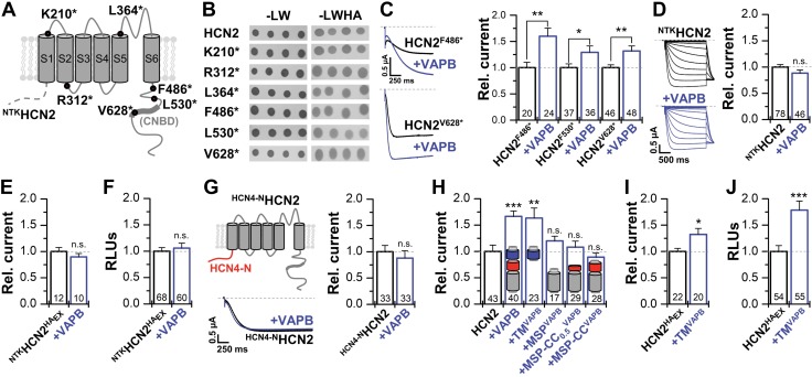 Figure 2. Domains mediating the interaction of VAPB with HCN2. A) Schematic illustration of a HCN subunit. The CNBD and some of the truncation constructs studied are indicated. B) All truncation constructs exhibited a positive interaction, evident from growth on -LWHA dropout medium. C) Representative current traces and the relative currents for different C-terminal deletions expressed alone or with VAPB. D) Representative current traces and the relative current amplitudes for the N-terminal truncated NTKHCN2 expressed alone or with VAPB. E) Relative current amplitudes of NTKHCN2HAEx (extracellular HA-tag) expressed alone or with VAPB. F) Relative surface expression of NTKHCN2HAEx expressed alone or with VAPB analyzed as relative light units (RLUs). G) Schematic illustration, representative traces, and currents of a HCN2 channel chimera with the N terminus of HCN4 (HCN4-NHCN2) expressed alone or with VAPB. H) Relative currents of HCN2 expressed alone or coexpressed with VAPB (1.7 ± 0.1), TMVAPB (1.6 ± 0.2), the MSP domain (MSPVAPB), the MSP with half of the CC domain (MSP-CC0.5VAPB), or with the complete CC domain (MSP-CCVAPB). I, J) Relative current amplitudes of HCN2HAEx expressed alone or with TMVAPB (1.3 ± 0.1) (I) and the respective changes in the relative surface membrane expression analyzed as RLUs, using a single cell chemiluminescence assay (TMVAPB 1.8 ± 0.2) (J). All data are presented as means ± sem. The number of experiments (n) is indicated in the respective bar graphs. N.s., not significant. *P < 0.05, **P < 0.01, ***P < 0.001 [unpaired Student’s t test (E), Mann-Whitney U test (C, D, F–H, J), or Welch’s t test (I)]. |