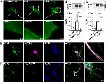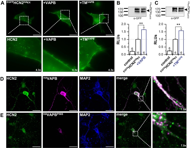 Figure 3. VAPB determines surface expression and dendritic localization of HCN2. A) Live cell imaging of HeLa cells transfected with an N-terminally EGFP-tagged HCN2 carrying an extracellular HA-epitope (EGFPHCN2HAEx) alone or cotransfected with VAPB or the TM segment of VAPB (TMVAPB). B) Chemiluminescence assays of fixed non-permeabilized HeLa cells, analyzing the surface expression as relative light units (RLUs) for EGFPHCN2HAEx alone and after cotransfection with VAPB (1.6 ± 0.1). Upper inset illustrates a representative control Western blot showing an unaltered HCN2 protein expression. C) Chemiluminescence surface expression assay as in B, but using TMVAPB (1.6 ± 0.1). D) Immunocytochemistry of HAVAPB transfected cortical neurons. Endogenous HCN2 (green) is colocalizing (white) with HAVAPB (magenta) in the soma and dendrites. Anti–MAP2-staining illustrating an intact neuronal network and dendrites (blue). E) Immunocytochemistry experiment as in D, but transfecting the ALS8 mutation HAVAPBP56S (magenta), leading to an aggregation of VAPBP56S in the soma of the neurons. Also, HCN2 fluorescence (green) was focused in the soma and dendritic localization was lost, despite an intact neuronal network (α-MAP2, blue). Scale bars, 20 µm (A, D, E). All data are presented as means ± sem. The number of experiments (n) is indicated in the respective bar graphs. **P < 0.01 (unpaired Student’s t test). |