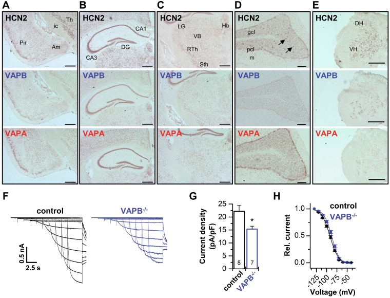 Figure 4. Codistribution of VAPs with HCN2 and contribution to thalamic Ih. AâE), Distribution of HCN2, VAPB, and VAPA mRNA in mouse brain and spinal cord. ISH analysis of HCN2, VAPB, and VAPA using DIG-labeled riboprobes, revealing mRNA expression of VAPB in cortical areas (A), hippocampus (B), thalamus (C), cerebellum (D) (arrows point to interneurons in the granular layer), and spinal cord (E). Note the overlapping distribution of VAPB with HCN2 and VAPA mRNA. Am, amygdala; CA, cornu ammonis; DG, dentate gyrus; DH, dorsal horn; gcl, granule cell layer; Hb, habenulae; ic, internal capsule; LG, lateral geniculate ncl.; m, molecular cell layer; pcl, Purkinje cell layer; RTh, reticular thalamic ncl.; Sth, subthalamic ncl.; VB, ventrobasal thalamus; Th, thalamus; VH, ventral horn. F) Representative current traces elicited in slice patch-clamp experiments of the ventrobasal thalamus (VB) of wild-type animals (control) and VAPBâ/â mice. G) The Ih current was significantly reduced in VAPBâ/â mice (15.4 ± 1.1 pA/pF) compared with control animals (22.2 ± 2.3 pA/pF). H) Average activation curves of the VB Ih current for control and VAPBâ/â mice. V1/2 of activation for control (â91.6 ± 1.3 mV, n = 8) and VAPBâ/â (â87.5 ± 1.2 mV, n = 7). Scale bars: 500 µm (AâC, E), 100 µm (D). All data are presented as means ± sem. The number of experiments (n) is indicated in the respective bar graphs. *P < 0.05 (unpaired Studentâs t test). |