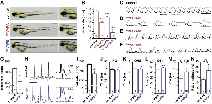 Figure 5. Bradycardia in knock-down zebrafish embryos and VAPB−/− mice. A) Zebrafish embryos at 72 hpf. Control-injected and MO-injected embryos against VAPA (MOVAPA) or VAPB (MOVAPB) exhibit no significant abnormalities (left), particularly no structural heart defects (right). Note a light cardiac edema in MOVAPB and a strong edema in MOVAPA. B) Heart rate in beats per minute (bpm) of control and MOVAPA, MOVAPB, or MOVAPA/B injected zebrafish embryos at 72 hpf. C) Representative examples of calcium transients (relative fluorescence intensity) in the cardiac atrium (black) and cardiac ventricle (gray) of control-injected zebrafish at 72 hpf, displaying a regular atrio-ventricular propagation of excitation from atrium to ventricle in a 1:1-ratio. D, E), Representative calcium transients recorded in MOVAPA/B double knock-down morphants, illustrating strongly reduced heart rates with variable frequency. F) Representative example of atrial and ventricular calcium measurements from a MOVAPA/B morphant with a 2:1 atrio-ventricular block, in which only every second atrial excitation leads to a ventricular excitation. Data were obtained from 3 independent batches of injections (A–F). G) Heart rate in beats per minute (bpm) of VAPB−/− mice compared with wild-type littermates (control), analyzed by using tail-cuff measurements. H) Representative surface ECG recordings of VAPB−/− mice and their wild-type littermates (control). ECGs of VAPB−/− mice show bradycardia and an increased T-wave amplitude. I–N) Analyses of the ECG parameters of VAPB−/− mice. I) Heart rate in beats per minute (bpm). J) PQ interval (PQ) duration. K) QRS complex (QRS) duration. L) Frequency corrected QT interval (QTc). M) Frequency-corrected Tpeak to Tend duration (Tp-Tec). N) T-wave amplitude (JTp). Scale bars: 500 µm (A); 500 ms (C–F), and 100 ms (H). All data are presented as means ± sem. The number of animals (n) is indicated in the respective bar graphs. N.s., not significant. *P < 0.05, **P < 0.01, ***P < 0.001 [Student’s t test (G, H, J–N) or Welch’s t test (B, I)]. |