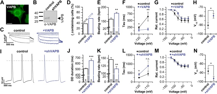 Figure 6. VAPB modulates If of spontaneously beating cardiac HL-1 cells. A) Immunocytochemistry of VAPB in HL-1 cells. Scale bar, 20 µm B) Western blot illustrating the knock-down of VAPB expression in HL-1 cells by shRNA transfection. Control, HL-1 cells transfected with scrambled shRNA. C) Representative If currents of HL-1 cells under control conditions and after VAPB transfection. D) Percentage of HL-1 cells containing If under control conditions (38%) and after VAPB transfection (58%). E) Beating frequency under control conditions (158 ± 4) and after VAPB transfection (179 ± 4), analyzed by optical counting of contractions in original Claycomb medium containing norepinephrine (60). F) Accelerated activation kinetics of VAPB-transfected HL-1 cells (n = 9–10). G) Activation curves of HL-1 cells under control conditions (n = 10) and after VAPB transfection (n = 11). H) Positive shift in the V1/2 of activation of If recorded in VAPB transfected HL-1 cells. Control (scrambled shRNA), −90.3 ± 3.4 mV (n = 10); VAPB transfected, −79.6 ± 2.7 mV (n = 11). I) Representative action potential measurements of wild-type HL-1 and shRNA transfected cells (shVAPB). J) Analysis of the diastolic depolarization (DD duration). K) Beating frequency of HL-1 cells under control conditions and after VAPB knock-down. L) VAPB knock-down slows the activation kinetics (n = 5) of endogenous If currents. M) Transfection of shRNA (n = 5) shifts the voltage-dependence of activation (V1/2) of If to more negative potentials (n = 6). N) V1/2 values for control (scrambled shRNA) were −88.2 ± 3.1 mV (n = 6) and for shRNA-transfection (shVAPB), −96.2 ± 2.3 mV (n = 5), respectively. (I, J), Scrambled shRNA was used as control. All data are presented as means ± sem. The number of experiments (n) is indicated in the bar graphs. N.s., not significant. *P < 0.05, **P < 0.01, ***P < 0.001 [unpaired Student’s t test (D, G, H, M) or Mann-Whitney U test (E, F, J–L, N) |