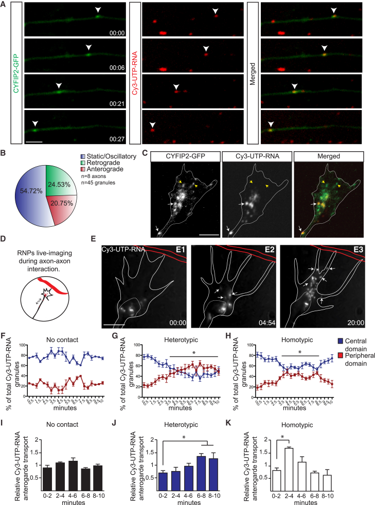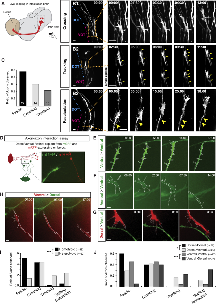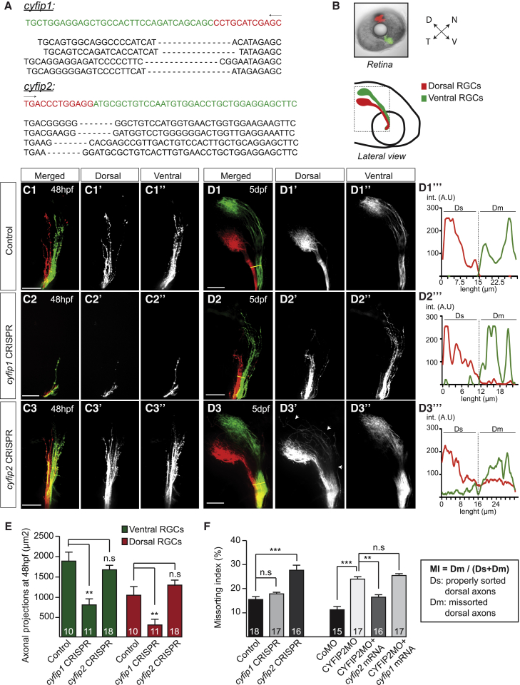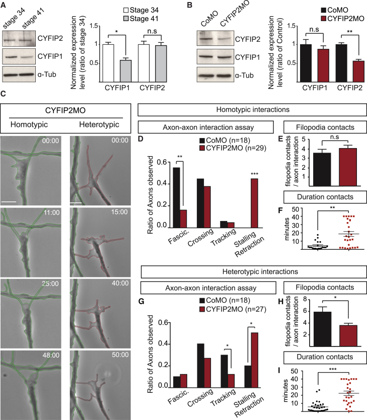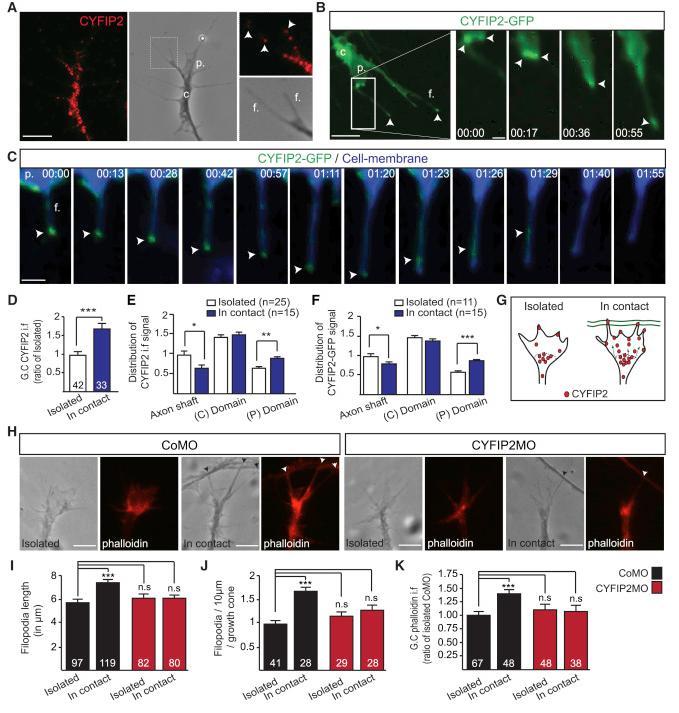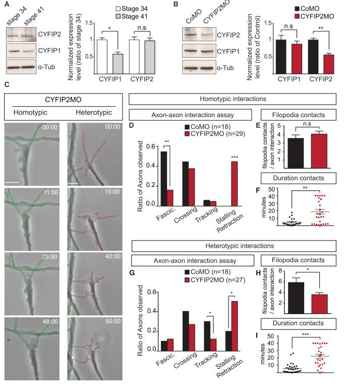 The axons of retinal ganglion cells (RGCs) are topographically sorted before they arrive at the optic tectum. This pre-target sorting, typical of axon tracts throughout the brain, is poorly understood. Here, we show that cytoplasmic FMR1-interacting proteins (CYFIPs) fulfill non-redundant functions in RGCs, with CYFIP1 mediating axon growth and CYFIP2 specifically involved in axon sorting. We find that CYFIP2 mediates homotypic and heterotypic contact-triggered fasciculation and repulsion responses between dorsal and ventral axons. CYFIP2 associates with transporting ribonucleoprotein particles in axons and regulates translation. Axon-axon contact stimulates CYFIP2 to move into growth cones where it joins the actin nucleating WAVE regulatory complex (WRC) in the periphery and regulates actin remodeling and filopodial dynamics. CYFIP2's function in axon sorting is mediated by its binding to the WRC but not its translational regulation. Together, these findings uncover CYFIP2 as a key regulatory link between axon-axon interactions, filopodial dynamics, and optic tract sorting.