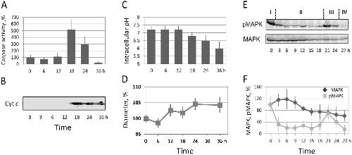 Fig. 1. Cell death events in ionophore-treated Xenopus eggs. In vitro matured Xenopus eggs were treated with 1 μM calcium ionophore A23187 for 5 min and monitored over the indicated times. Caspase activation (A), cytochrome c release (B), intracellular pH (C), and egg diameter (D) are shown. Western blots of phospho-MAPK and MAPK and their quantification are presented in panels E and F. Fractions I, II, III, IV in panel E denote the pooled samples prepared from meiotically arrested, post-meiotic, apoptotic, and post-apototic eggs, respectively. Bars in panels A, C, D, F indicate SDs of three to five measurements obtained in different experiments.