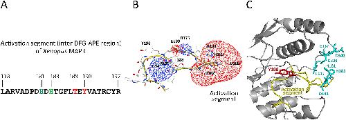 Fig. 4. Activation segment of Xenopus MAPK. (A) Amino acid sequence of the activation segment. Phosphoregulatory residues are shown in red and histidine residues protonated at ∼ pH 6.0 are presented in green. (B) Electrostatic potentials in the activation segment. Positive potentials are shown in blue and negative potentials in red. (C) Catalytic cleft of Xenopus MAPK. The activation segment is presented in yellow, phosphoregulatory tyrosine T190 is shown in red, and negatively charged residues of the activation segment and loop L16 are in cyan. (For interpretation of the references to color in this figure legend, the reader is referred to the Web version of this article.)