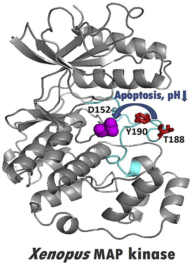 Fig. 3. Activity of recombinant MAPK at different pH and Xenopus MAPK structure. Specific phosphate incorporation into the recombinant Xenopus GST-MAPK (Auto, red bars) and the exogenous substrate (MBP, blue bars) at pH 7.5 and 6.5, as determined in the in vitro kinase assay, are presented in panel A. Modeled 3D structure of Xenopus MAPK is shown in B. The activation segment is shown in cyan, the catalytic residue (D152) is colored in magenta, and phospho-regulatory residues T188 and Y190 are shown in red. Bars in panel A represent SDs of four measurements. (For interpretation of the references to color in this figure legend, the reader is referred to the Web version of this article.)