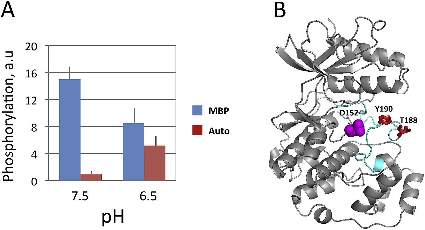 Fig. 3. Activity of recombinant MAPK at different pH and Xenopus MAPK structure. Specific phosphate incorporation into the recombinant Xenopus GST-MAPK (Auto, red bars) and the exogenous substrate (MBP, blue bars) at pH 7.5 and 6.5, as determined in the in vitro kinase assay, are presented in panel A. Modeled 3D structure of Xenopus MAPK is shown in B. The activation segment is shown in cyan, the catalytic residue (D152) is colored in magenta, and phospho-regulatory residues T188 and Y190 are shown in red. Bars in panel A represent SDs of four measurements. (For interpretation of the references to color in this figure legend, the reader is referred to the Web version of this article.)