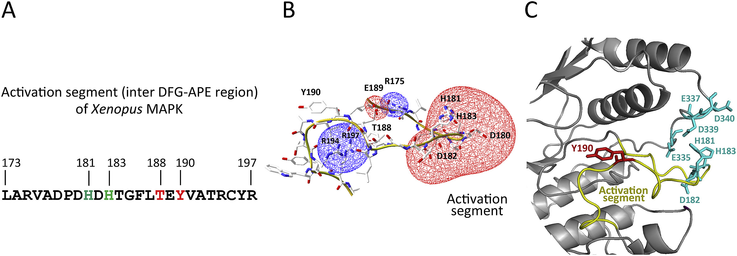 Fig. 4. Activation segment of Xenopus MAPK. (A) Amino acid sequence of the activation segment. Phosphoregulatory residues are shown in red and histidine residues protonated at ∼ pH 6.0 are presented in green. (B) Electrostatic potentials in the activation segment. Positive potentials are shown in blue and negative potentials in red. (C) Catalytic cleft of Xenopus MAPK. The activation segment is presented in yellow, phosphoregulatory tyrosine T190 is shown in red, and negatively charged residues of the activation segment and loop L16 are in cyan. (For interpretation of the references to color in this figure legend, the reader is referred to the Web version of this article.)