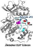 Fig. 3. Activity of recombinant MAPK at different pH and Xenopus MAPK structure. Specific phosphate incorporation into the recombinant Xenopus GST-MAPK (Auto, red bars) and the exogenous substrate (MBP, blue bars) at pH 7.5 and 6.5, as determined in the in vitro kinase assay, are presented in panel A. Modeled 3D structure of Xenopus MAPK is shown in B. The activation segment is shown in cyan, the catalytic residue (D152) is colored in magenta, and phospho-regulatory residues T188 and Y190 are shown in red. Bars in panel A represent SDs of four measurements. (For interpretation of the references to color in this figure legend, the reader is referred to the Web version of this article.)