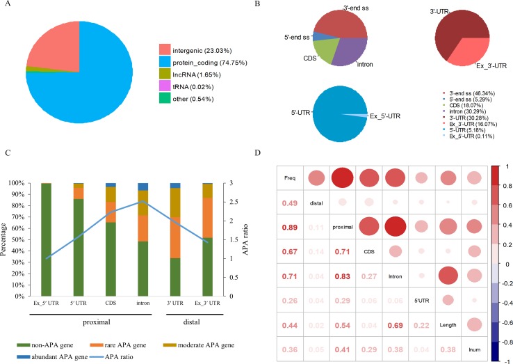 Figure 1. Genomic distribution of poly(A) sites in X. tropicalis. (A) Distribution of different types of genes. Protein-coding gene accounts for more than 97% of annotated genes. (B) Distribution of APA sites in different locations. “3′ end ss” refers to the 3′ UTR and the extended region of 3′ UTR. “5′ end ss” refers to the 5′ UTR and the extended region of 5′ UTR. “Ex_3′ UTR” refers to the extended region of 3′ UTR. “Ex_5′ UTR” refers to the extended region of 5′ UTR. (C) Distribution of APA frequencies in different genomic regions. The left y-axis denotes the percentage of respective genes with the poly(A) site(s) in the specific region. The right y-axis denotes the APA ratio, which is the ratio between the number of APA sites in the specific region and the number of genes these APA sites are located in. Proximal sites are defined as poly(A) sites located in non-3′ UTR regions, while distal sites are those in 3′ UTR or extended 3′ UTR regions. “non-APA gene” refers to no APA event in the gene. “rare APA gene” refers to one APA site per gene. “moderate APA gene” refers to two to four APA sites per gene. “abundant APA gene” refers to more than four APA sites per gene. “APA ratio” refers to the average number of APA per gene (APA site number/APA gene number). (D) The relationship among the APA frequency, the gene length, the number of introns, etc. “Freq” represents the frequency of APA sites in the gene; “Length” represents the length of a gene; “Inum” represents the number of introns; “5′ UTR,” “CDS,” and “Intron” represent the frequency of APA sites in the respective genomic regions, respectively. “proximal” represents the frequency of APA sites in CDS, intron, or 5′ UTR regions. “distal” represents the frequency of APA sites in 3′ UTR.