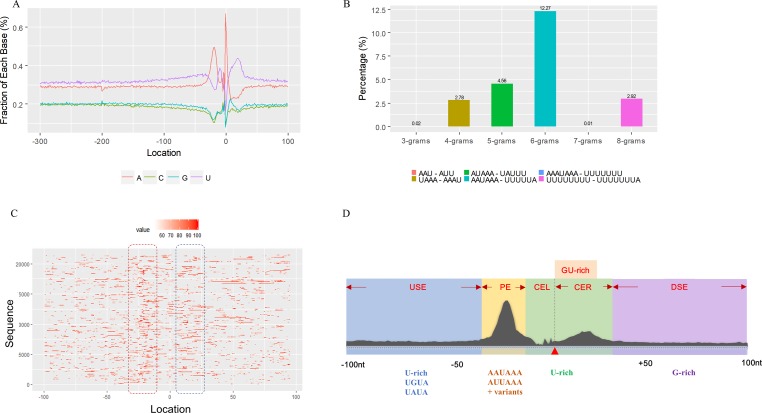 Figure 2. Characteristics of poly(A) signals. (A) Nucleotide profiles surrounding poly(A) sites. (B) The difference of frequency between the highest signal and the second highest signal (displayed in the legend) with different pattern sizes. (C) Top 50 hexamers visual alignment as in the sequence graphics view. Each sequence is present as a single pixel on a horizontal line, and the bright spot represents each occurrence of the signal patterns with respect to their locations on each sequence. The pattern is ranked according to the total frequency that appears in the dataset. The higher the ranking is, the brighter the point is represented. The continuous vertical band of lines from top to bottom indicates the common locations of the signal element. AAUAAA (brightest point) mainly appears around −30 nt to −10 nt (the red dashed box), and the signal aggregation was also observed around +20 nt (the blue dashed box). (D) Schematic of cis elements for poly(A) sites in X. tropicalis. Five regions were determined based on the nucleotide composition profile and the signal analysis. The GU-rich element is overlapped with the downstream U-rich element.